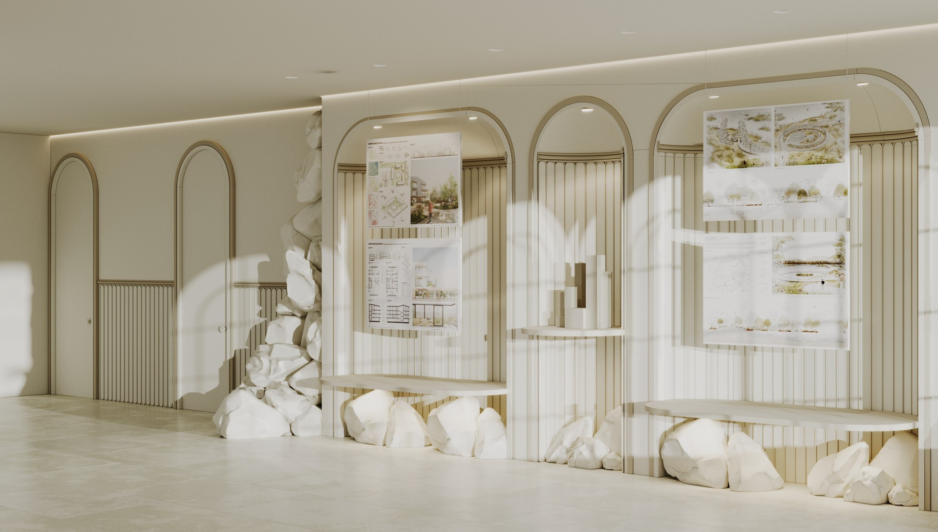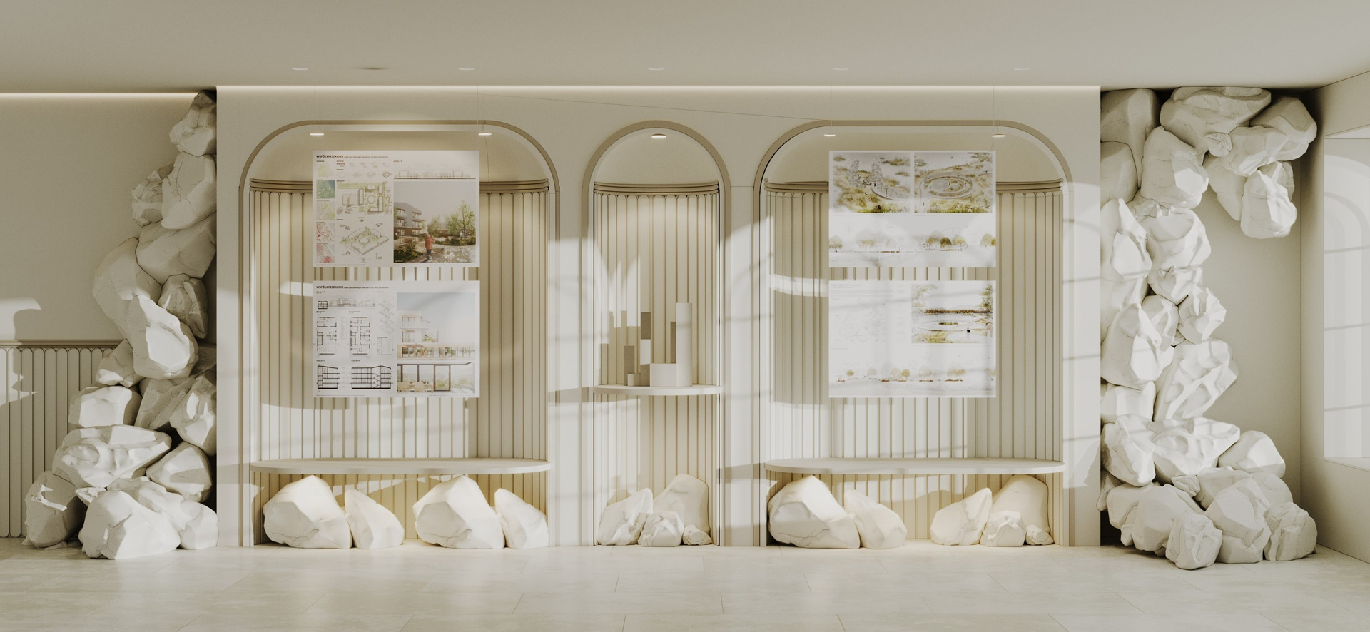 «Руины», из которых вырастает выставочная конструкция, символизируют зарождение идеи- начала всего нового, которое служит фундаментом для сооружения грандиозных проектов- и в архитектуре, и в интерьере, графике, и в сфере дизайна костюма. Выстовачная конструкция мобильная и трансформируется. Полки, которые служат основой для выставления архитектурных макетов зданий, можно регулировать. В «окнах» выставочного стенда также можно повесить планшеты с проектами студентов.