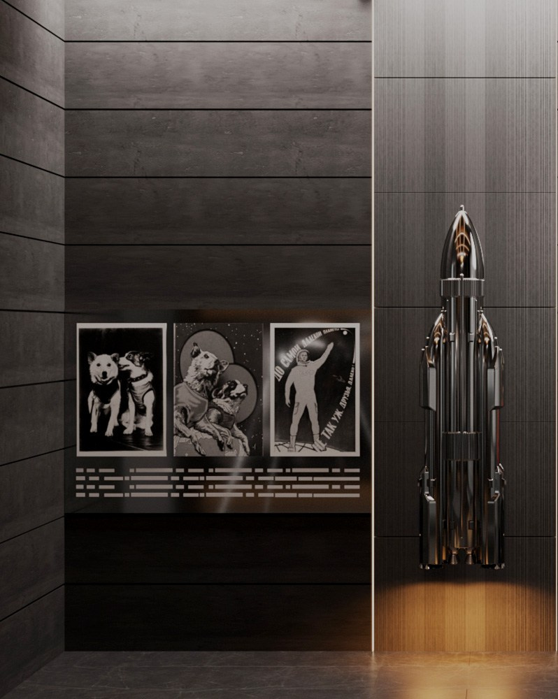 Выставочное пространство — это путь человека в новый мир, который начинается его исследованиями и заканчивается колонизацией другой планеты. Первый зал посвящен ученому, конструктору Королеву. Он выполнен в темной отделке и дополнен теплым, мягким светом, олицетворяющим топливо ракеты, энергию, благодаря которой человек оказался в космосе. Это неизведанное пространство описывается во втором зале, в котором мы впервые сталкиваемся с сопровождением живой музыки. Светлый, чистый мир, укутанный в зелени, это олицетворение новой планеты, в которой мы оказываемся в третьем зале, а отпечатки пальцев на стенах как образ постепенного внедрения человека в новый мир. Здесь представлены проекты ученых со всего мира, направленных на будущие исследования космоса и колонизацию новых планет.